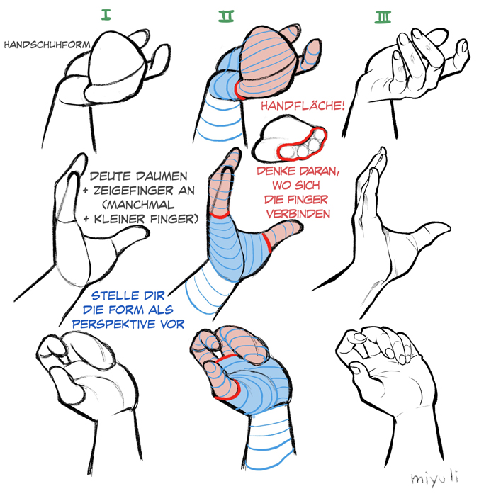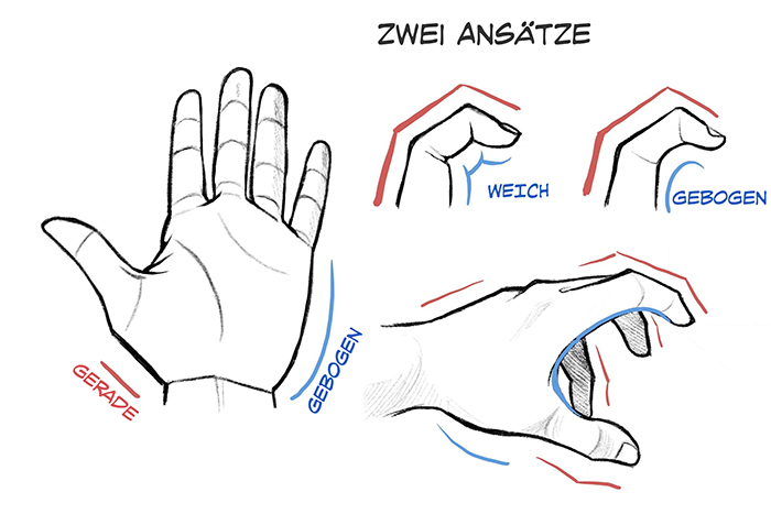 Die Formen der Hand mit kräftigen geraden und gekrümmten Linien dargestellt, kann die Handbewegungen dynamischer und ausdrucksvoller machen. Je mehr du die Handfläche siehst, desto weicher werden die Formen. Manchmal kann es je nach Winkel und Handform variieren.