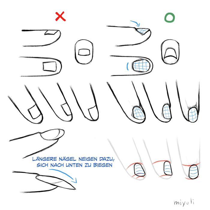 Die Nägel sind nicht flach. Sie wickeln sich um die Form des Fingers. Achte darauf, wie sie sich an die Haut anpassen. Das kann sich von Person zu Person leicht unterscheiden.