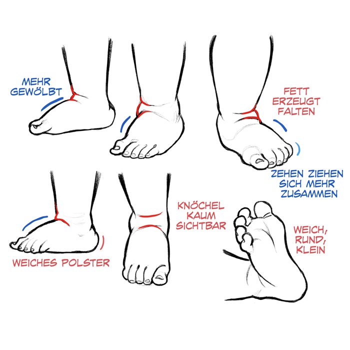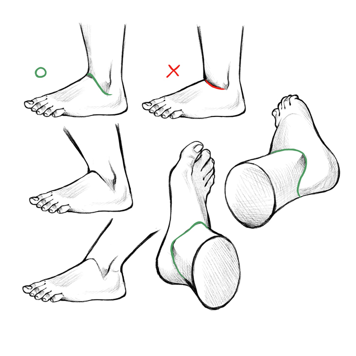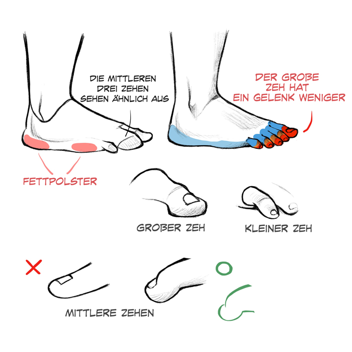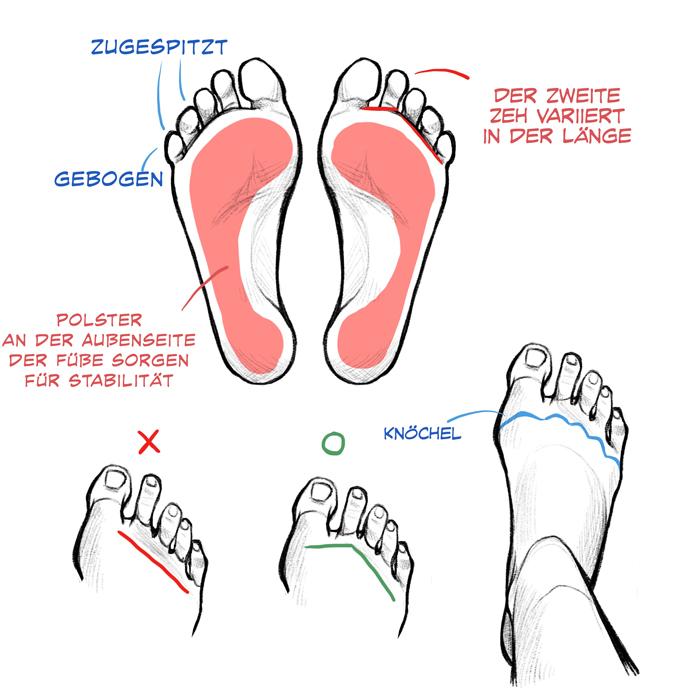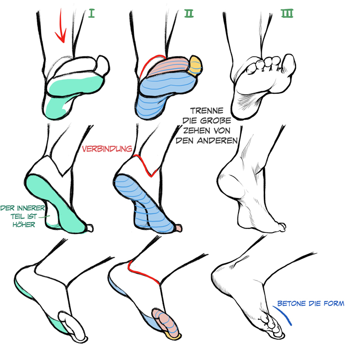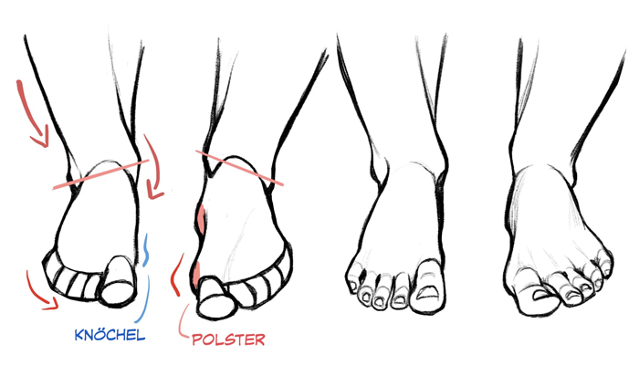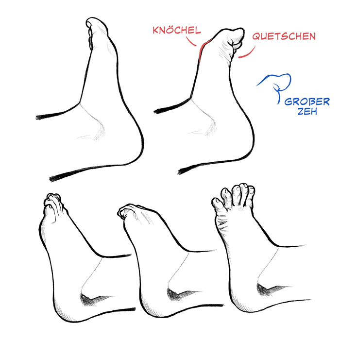 Genau wie beim Zeichnen der Händen ist es besser, die Füße in einfachere Formen zu gliedern. Die Bewegung der Füße ist eingeschränkter als die der Hände, da sie hauptsächlich zum Stehen und Gehen verwendet werden. Der große Zeh kann getrennt von den anderen Zehen betrachtet werden, um die dynamischste Haltung zu finden. Das Zeichnen der Fußsohle kann aus bestimmten Blickwinkeln schwierig sein. Der innerer Teil ist höher und berührt kaum den Boden.