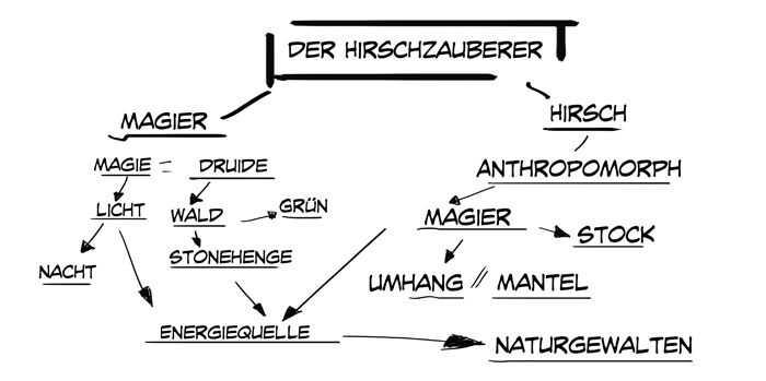 Notiere dir das Schlüsselwort in der Mitte eines Blatts und zeichne einen Kreis darum, um es als wesentliches Element zu kennzeichnen. Konzentriere dich dann auf die relevantesten Ideen, die mit diesem Thema zu tun haben. Wenn du sie dir auf Papier schreibst, wirst du sie definitiv nicht vergessen. Außerdem kannst du dir so einen Plan dafür erstellen, was du zeichnen möchtest. Für diese Lektion habe ich das Thema „Hirschzauberer” ausgewählt und es in alle Informationen aufgeteilt, die während des Briefings erwähnt wurden. Jedes dieser Wörter ist eine Inspiration für sich und durch das Verbinden dieser baust du eine Geschichte auf und entwickelst das Thema. Sobald ich genug Elemente in meinem Plan habe, beginne ich mit dem Skizzieren.
