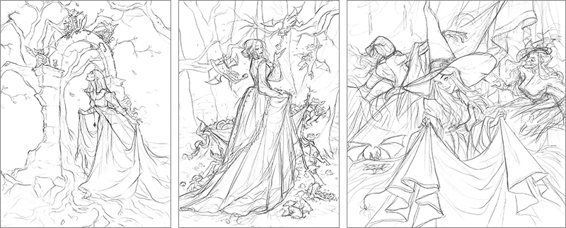 Während des Brainstormings recherchierte ich einige Details für mein Werk, beispielsweise wie der zerstörte Torbogen und das wallende Gewand als Teil des Hauptthemas. Ich suche auch gerne nach Bildern, die ein ähnliches Gefühl hervorrufen, das ich in meinem eigenen Werk erwecken möchte. Ich liebe die dunkle, gotische und fantasievolle Ästhetik, daher sind wallende Stoffe und elegante Posen in meiner Arbeit sehr wichtig. Ich bin stark von Illustratoren des Goldenen Zeitalters wie Arthur Rackham, Edmund Dulac, John Bauer und Ida Rentoul Outhwaite geprägt. Ich liebe die Verspieltheit und Eleganz in ihren Werken, besonders wenn sie mit dunkleren Motiven kombiniert werden wie Hexen und Monstern aus Märchen.