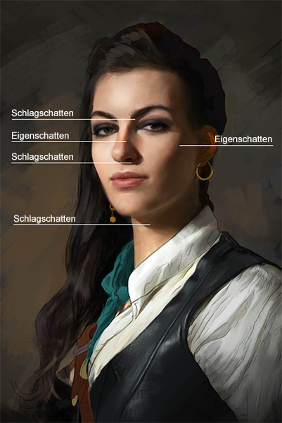 Ein anderer wichtiger Faktor im Zusammenhang mit Licht ist die Differenzierung zwischen Schlag- und Eigenschatten. Eigenschatten sind Schatten, die auftauchen, wenn sich die Form eines Objekts ändert und dabei Schatten entstehen. Ein Schlagschatten wird hingegen von einem anderen Objekt verursacht, wie beispielsweise der Nase. Solche Schatten sind auffallend stark, wohingegen Eigenschatten eher weich sind, da sie mit der Form verlaufen.