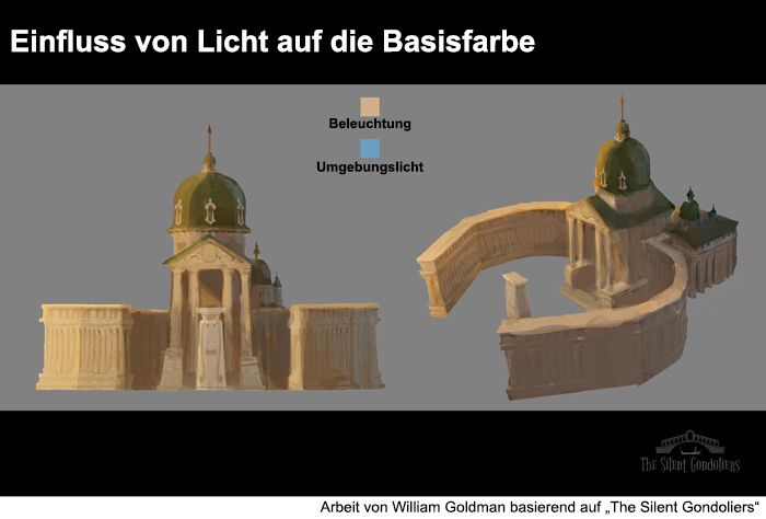 Ich füge das Licht immer am Ende hinzu, weil es mir hilft, meinen Fokus und den Verlauf der Betrachtung im Bild zu verfeinern. Unsere Augen reagieren auf dunkle Formen und folgen Kontrasten. Beleuchtung ist der beste Weg, um einen offensichtlichen Schwerpunkt und Kontrast zu schaffen. Es ist einfacher, die Beleuchtung vor dem letzten Schritt zu entscheiden. Deshalb arbeiten Visual Development-Künstler auch an der Farbgebung, um zu visualisieren und die Lenkung der Bildbetrachtung zu planen, bevor mehr Details hinzukommen.
