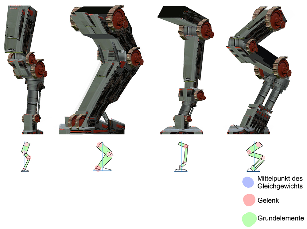 Wenn der Grundriss steht, fange ich an, die Grundelemente zu verbinden und sie wie Legostücke zu drehen, um sie zu komplexeren Formen zu kombinieren. Ich erstelle verschiedene Variationen davon, wie das Bein meines Mechs aussehen könnte. Ich benutze meistens die gleichen vier Teile, um diese Konzepte zu erstellen. Wenn man sie quetscht und dehnt, kann man viele verschiedene Kombinationen bilden. Bei der Konstruktion von zweifüßigen Mechs ist es wichtig, die Neigung der Gelenke anzugleichen. Sie können breite „Füße“ haben oder das Bein mit der „Ferse“ des Konstrukts ausbalancieren, ähnlich wie bei einem Velociraptor.