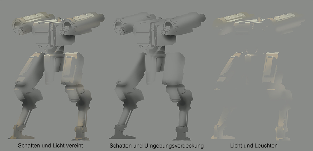 Vom Grundgerüst ausgehend bringe ich eine Lichtquelle mit ein und passe die Lichtverhältnisse an der Textur an. In dieser Phase versuche ich, das „zusammengefügte“ Gefühl zu beseitigen, das durch die Fotomanipulation anfänglich erzeugt wird. Ich benutze Schatten, um Teile des Fotos zu korrigieren, die nicht zu meinem Lichtszenario passen. Diese Schatten helfen auch einige Details und Störungen zu minimieren, die das Design durcheinander bringen. Die Lichtebenen heben das Volumen der Formen hervor und verdeutlichen, wie sich das Licht über jedes einzelne der Grundbauteile ausbreitet. Während die Beleuchtung in der vorherigen Phase einbezogen wurde, ist sie jetzt abgeschlossen und definiert den Mech eindeutig.