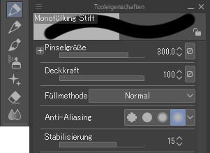 Als Nächstes wechsle ich zum [Marker] unter der Sub-Tool-Palette vom [Pen] und wähle [Fill-in-mono pen] (siehe Abbildung unten). Ich setze diesen Stift beim Zeichnen immer auf [Anti-Aliasing]. Um Aliasing mache ich mir keinen Kopf, weil ich farbige Comics erstelle, daher ist das für mich nicht besonders wichtig.