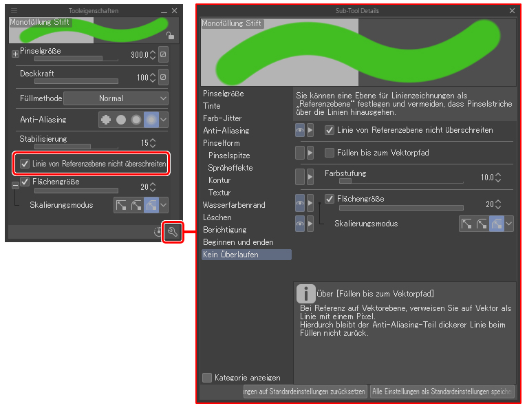 Dann werde ich mit meinen Farben, die ich grob für meine Strichzeichnungen von Yooka ausgewählt habe, verdeutlichen, was du mit der [Kein Überlaufen] Funktion von CLIP STUDIO PAINT erreichen kannst. Zuerst müssen wir auf der linken Seite des Bildschirms in den Tooleigenschaften des [Fill-in mono pen] Tools weiter nach unten scrollen. Dort finden wir direkt unter [Stabilisierung] die Option [Linie von Referenzebene nicht überschreiten]. Wenn du hier ein Häkchen setzt, wird die Option aktiviert. Wenn du zusätzlich auf das Schraubenschlüssel-Symbol rechts unten in der [Tooleigenschaften] Palette klickst, wird dir die [Sub-Tool Details] Palette angezeigt. In diesem Dialogfenster ist die gleiche Option [Linie von Referenzebene nicht überschreiten] unter [Stabilisierung] am Ende auf der linken Seite der Liste zu finden.