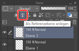 Nachdem ich sie aktiviert und bestätigt habe, wähle ich die Ebene mit der Linienzeichnung aus der [Ebene] Palette aus. Dann klicke ich auf das Leuchtturmsymbol im oberen Teil der Ebenenpalette. Dieses Symbol steht für [Als Referenzebene anlegen]. Drauf geklickt, wird die ausgewählte Ebene zu einer Referenzebene, auf die sich die Farbebene bezieht, wenn ich mit der groben Koloration beginne.
