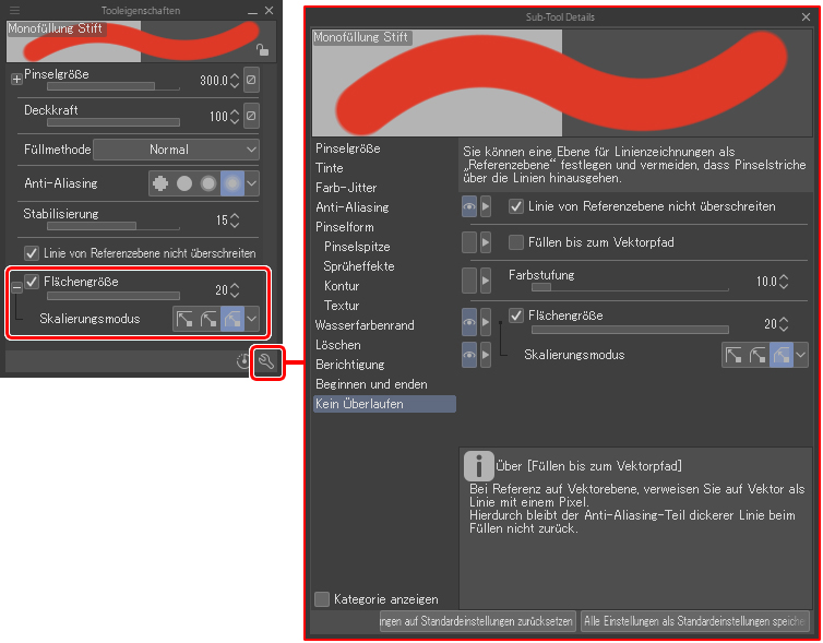 Außerdem möchte ich hier noch die [Flächengröße] Funktion in den Sub-Tooleinstellungen behandeln. Mit dieser Funktion kannst du den Bereich, den du kolorieren möchtest, so skalieren, dass du auch unter den Linien kolorieren kannst.