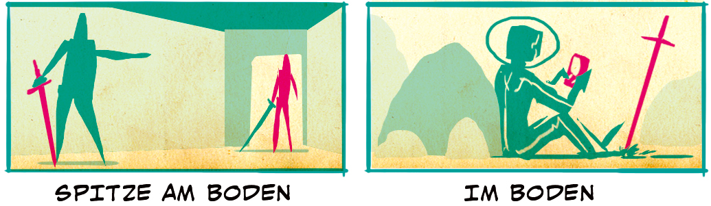 Obwohl es verlockend ist, direkt in die Schlacht zu ziehen, können Schwerter im Ruhezustand viel zur Kommunikation beitragen. Wenn die Spitze am Boden und Im Boden ist, symbolisiert das eine passive Haltung. Die Figuren hier sind bereit, zu kämpfen, wenn es die Situation erfordert. Gleichzeitig können sie aber auch sprechen (wie vorne links) oder zuhören (wie hinten rechts).