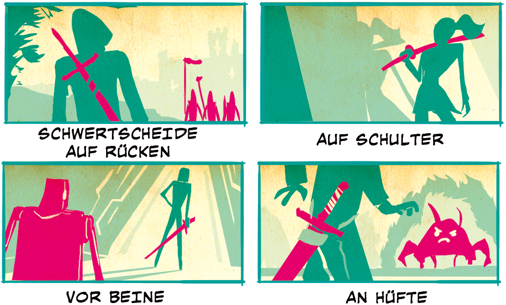 Szenen mit einer Schwertscheide auf dem Rücken lassen den Leser erkennen, dass der Charakter zwar nicht im Kampfmodus aber bewaffnet ist und sofort in Aktion treten kann. Beachte hier auch, dass das Schwert zu der Figuren in der Ferne zeigt, was auf eine mögliche Verbindung hinweist. Das Tragen Auf der Schulter ist eine eher kampfbereite Pose, hat aber immer noch einen Hauch von Gelassenheit. Dieser Charakter gehört wahrscheinlich zu den Verbündeten. Vor den Beinen haltend macht den Charakter einen Schritt kampfbereiter. Dies könnten vorübergehende Verbündete sein. Das Schwert befindet sich in einer passiven Position, ist aber bei Bedarf zur Hand. An der Hüfte zeigt das Schwert das höchste Level von Kampfbereitschaft. Das Panel zeigt ein Schwert und eine erhobene Hand sowie das anvisierte Ziel. Die Botschaft hier ist klar: Schwert trifft auf Monster.