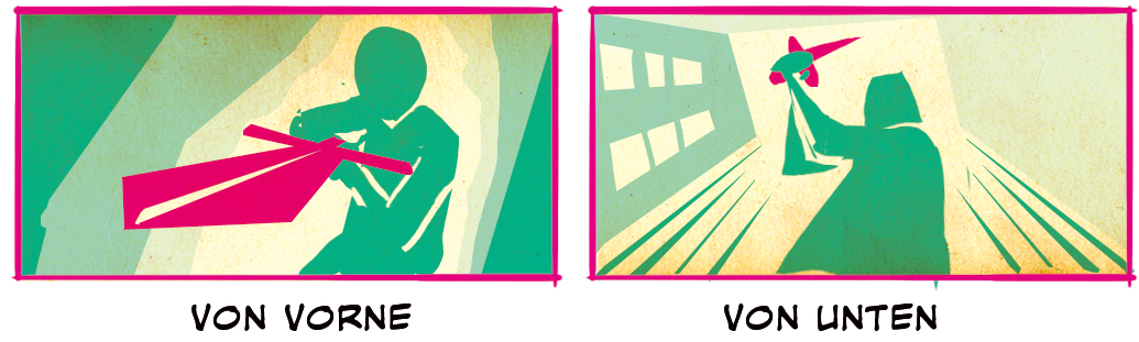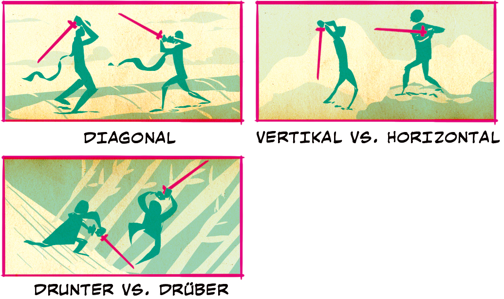 Die anderen Optionen Diagonal und Vertikal vs. Horizontal sind gute Möglichkeiten, um die Spannung kurz vor einem großen Schlag zu zeigen. Drunter vs. Drüber ist eine gute Gelegenheit, eine Neigung der Kamera und einen Charakter zu zeigen, der gekonnt einem Schlag ausweicht.