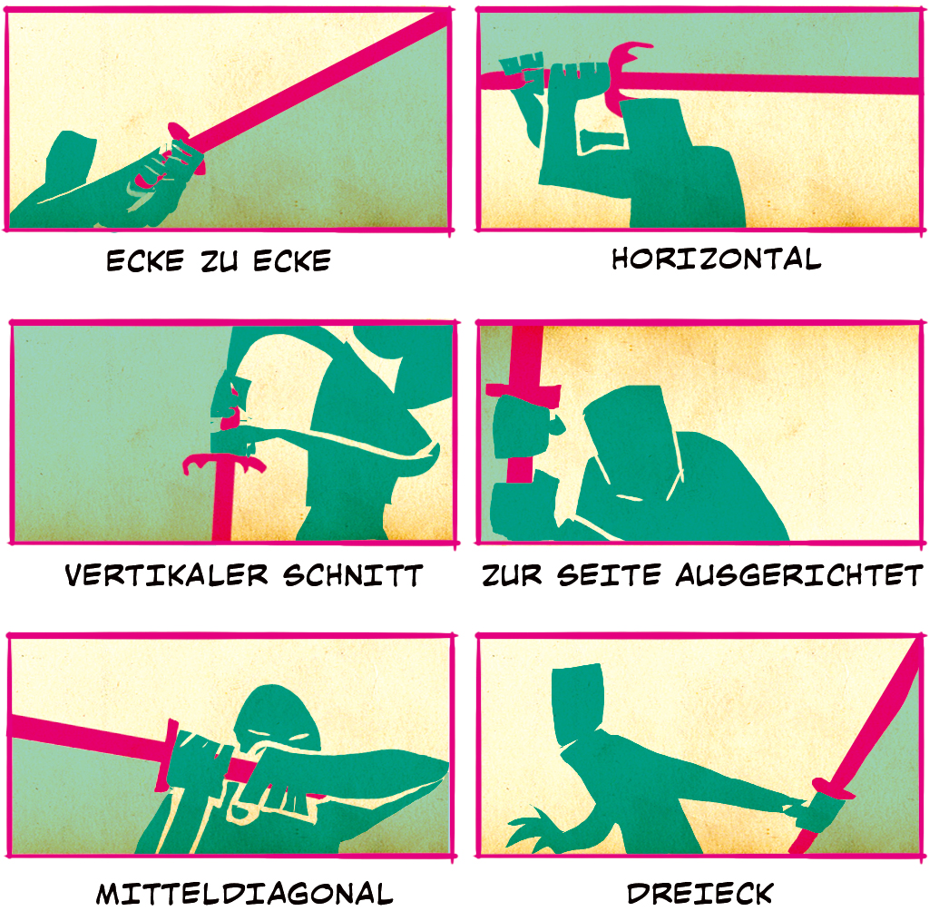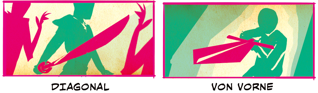 Diese Darstellungen eignen sich, um Schlachtfeld-Szenen aufzubrechen und sich direkt auf den Charakter zu konzentrieren. Hier ist sehr wichtig, dass das Schwert die Ecke des Panels trifft, um maximale Dynamik zu erzeugen. Es ist auch eine gute Möglichkeit, Panels visuell mittels einer starken Linie zu verbinden. Ecke zu Ecke und Horizontal zeichnest du am besten horizontal während Vertikaler Schnitt und Zur Seite ausgerichtet sich für vertikale Darstellungen eignen. Für dramatische Szenen geht nichts über Mitteldiagonal, wobei die Schwertlinie das Auge des Lesers direkt in das Auge des Charakters zieht, oder ein Dreieck, was den Charakter in einen Kampf eintauchen oder einen Schwung beenden lässt.