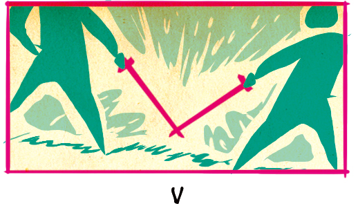 Schwerter im rechten Winkel bieten viele Vorteile für andere Anordnungen. Das kann z. B. sein, den Blick des Lesers durch die Szene von Charakter zu Charakter zu führen und gleichzeitig eine Anordnung der Kampfszene bereitzustellen, die sich von bisherigen Szenen unterscheidet. Das V ist eine Form des Aufeinandertreffens der Schneiden wie oben, aber der Fokus liegt eher auf den Spitzen der Klingen als nur auf den Charakteren selbst.