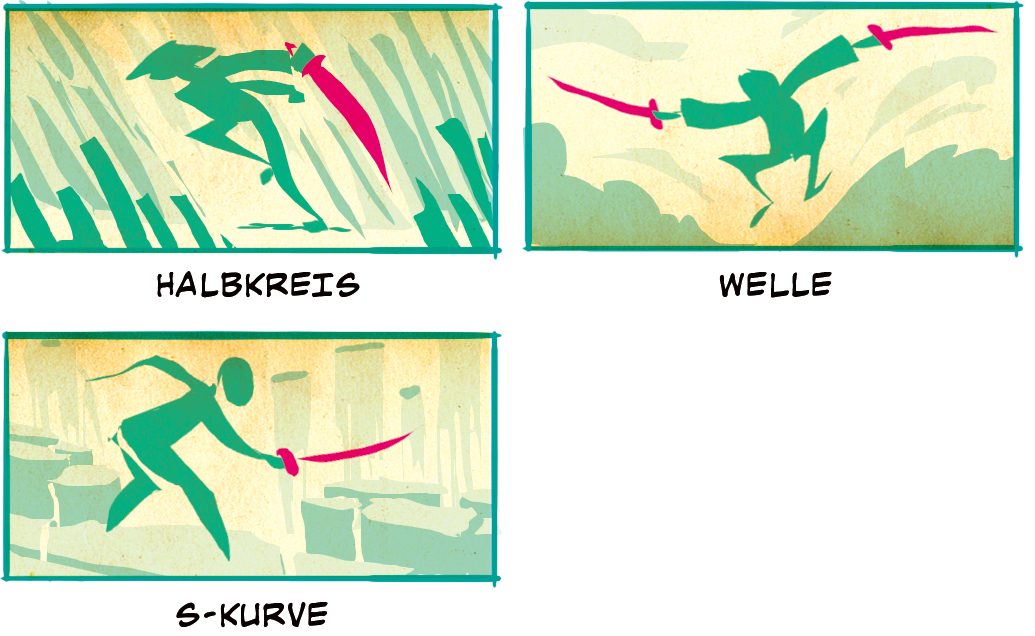 Diese Paneloptionen verwenden Bewegungslinien einer Figur und erweitern sie durch die Schwerter. Im Vergleich zum Schwert in anderen Panels nehmen diese Schwerter hier tendenziell die Bewegung des Charakters an, den Linien folgend, wie in Halbkreis, Welle und S-Kurve.