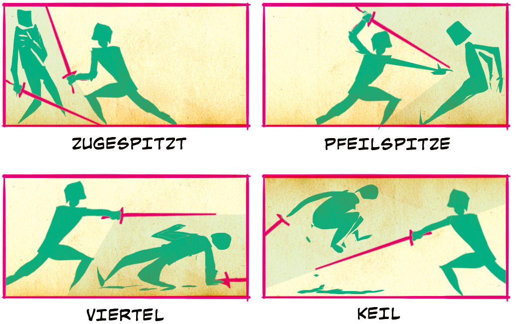 Schwertkämpfe haben eine einzigartige, visuelle Sprache aufgrund Ihrer erstaunlichen Anordnungsmöglichkeiten, die durch die kühnen, geraden Linien der Schwerter entstehen.