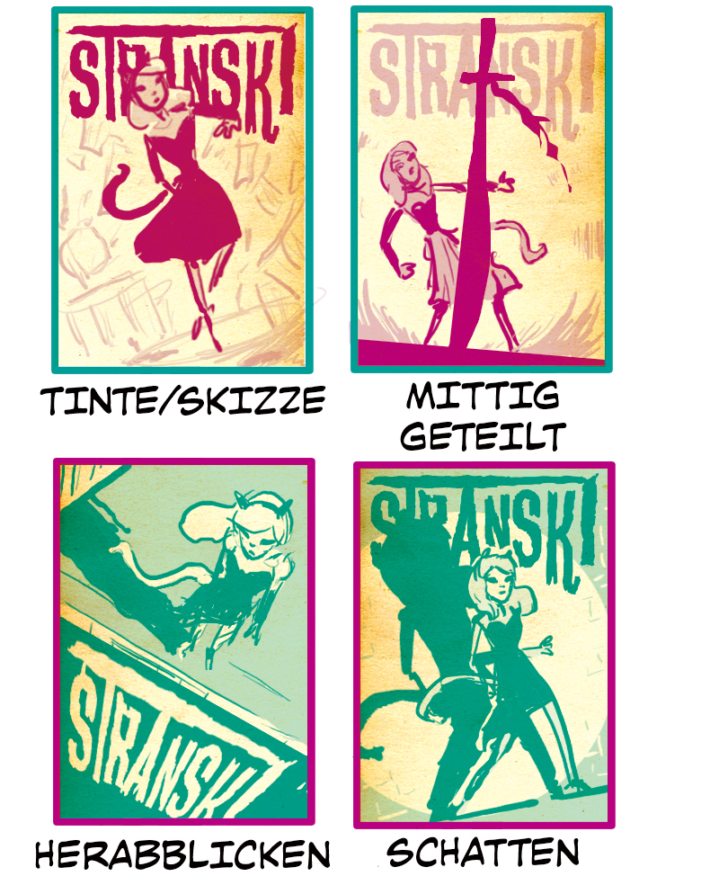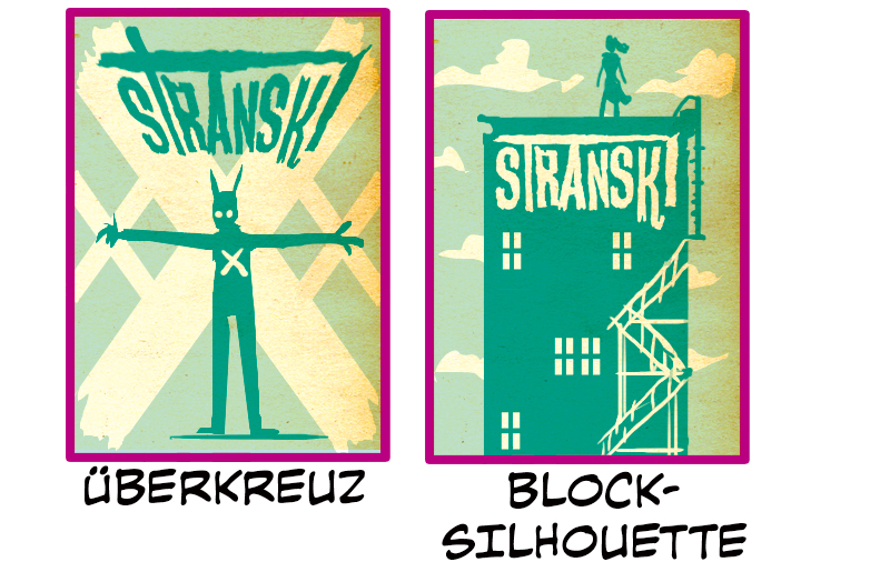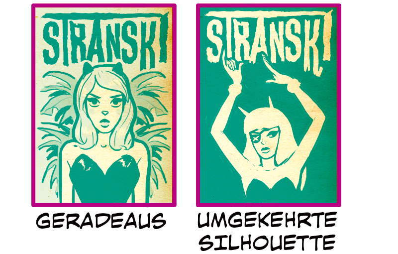 Geradeaus & Umgekehrte Silhouette sind vom Aufbau her ähnlich, und zwar in der Platzierung des Charakters: Der Oberkörper ist nach vorne gerichtet. Geradeaus verfügt über ein Hintergrundelement, das sich hinter der Figur ausbreitet. Es ist besonders wirkungsvoll, weil einem die Emotion des Charakters auch gleich ins Auge sticht. Die Umgekehrte Silhouette hat auch eine hohe, visuelle Wirkung, aber anstatt von der Figur oder den Hintergrundelementen ausgehend, kommt es von dem kontrastreichen Hintergrund, der das Auge des Betrachters gezielt zur Figur in der Mitte steuert.