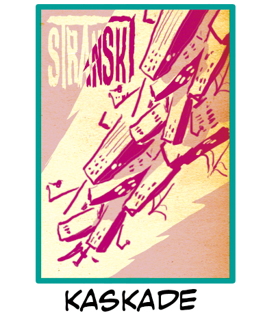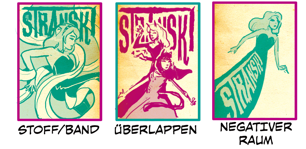 Stoff/Band verwendet ein Stück Stoff, das sich durch das Bild zieht, um das Auge des Betrachters vom Logo weiter zur Figur zu leiten. Die Wölbung des Bands muss nicht genau wie im Beispiel aussehen. Stelle lediglich sicher, dass der Betrachter sowohl zum Logo als auch zur Figur geführt wird. Darüber hinaus wurde das Beispiel hier für ein Publikum erstellt, dessen Muttersprache wie im Englischen eine Leserichtung von links oben nach rechts unten hat. Wenn du an eine Zielgruppe denkst, in deren Muttersprache man anders liest, solltest du das Band so anpassen, dass es diesen Lesefluss nachahmt, um die gleiche Dynamik wie im Beispiel beizubehalten. Überlappen verwendet einen ähnlichen Aufbau wie in Stoff/Band nur mit mehreren Charakteren. Stell dir einmal ein unsichtbares Band in Überlappen vor. Dadurch kannst du sehen, wie die Konstellation auf ähnliche Weise funktioniert. Wie bei Stoff/Band empfehlen wir, dem natürlichen Lesefluss der jeweiligen Muttersprache deines Zielpublikums zu folgen. Negativer Raum zeigt, wie ein Aufbau funktionieren kann, wenn er nicht den Richtlinien der Muttersprache entspricht. Das Logo ist in der zentralen Figur gezielt in eine andere Richtung geschrieben. Das Hauptmerkmal dieses Titelbildes ist jedoch nicht der Sprachfluss. Stattdessen wird der negative Raum verwendet, um die Figur/das Logo hervorzuheben. Du musst hier nicht jeden Bereich ausfüllen, um eine Wirkung zu erzielen.