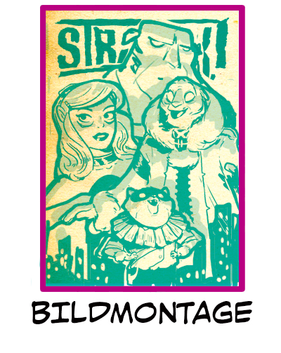 Bildmontage ist wahrscheinlich eine der bekannteren Konstellationen in dieser Reihe, da sie normalerweise für Comic-Cover verwendet wird. Es lohnt sich jedoch, einige der Techniken hier zu erwähnen, die diesen Aufbau wirkungsvoll machen. Dafür sind drei Hauptelemente nötig: ein Logo oben, Charaktere in der Mitte und das Drumherum unten. Die Charaktere stehen im Mittelpunkt und sind von fetten Linien umgeben, um sie von den anderen Elementen abzuheben. Wichtig ist hier auch, wie die dicken Linien die Charaktere voneinander trennen. Dies kann darauf hinweisen, dass sich alle diese Charaktere zwar in dieser Stadt befinden, aber nicht unbedingt im selben Team sind. Beachte auch, wie sich der Kamerawinkel unterscheidet, aus dem die einzelnen Charaktere gezeichnet werden, um sie weiter voneinander zu trennen. In der Bildmontage ist das Logo vorhanden, wird aber als Hintergrund behandelt und teilweise von den zentralen Figuren verdeckt.