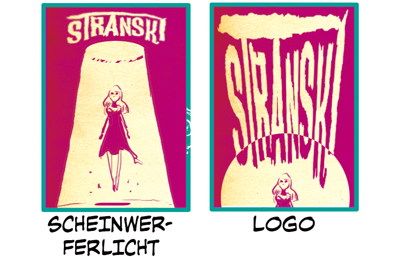 Scheinwerferlicht und Logo werden hier zusammen vorgestellt, obwohl das Scheinwerferlicht figurenbezogen und das Logo gegenstandsbezogen ist. Beide Cover-Beispiele zeigen dieselbe Szene aus unterschiedlichen Perspektiven und nutzen zwei kontrastierende Farben in ihrer jeweiligen Komposition. Mit Scheinwerferlicht liegt der Fokus des Titelbilds auf der schwebenden Figur in der Mitte, über der das Logo schwebt. Mit Logo schauen WIR auf den Charakter herab und ungefähr 80 % des Covers wird vom Logo eingenommen. Es ist auch stilistisch gedehnt, um die Richtung des Scheinwerfers bis zur Figur unten anzupassen.