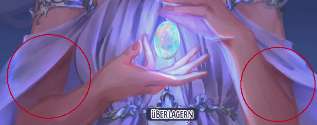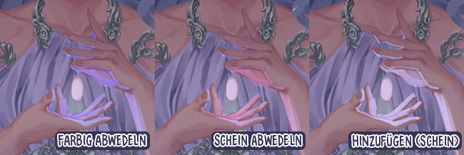 Experimentiere, welche Ebene speziell verwendet werden soll (mit Nachbelichten und Abwedeln)! Hier fand ich, dass die vorher genannte Füllmethode für dieses Stück am besten passt. Im Folgenden siehst du Beispiele wie Füllmethoden sich auf die Hände ganz unterschiedlich auswirken können, aber dennoch alle den Effekt hervorrufen, dass etwas so aussieht, als ob es leuchtet.