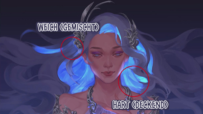 Dafür habe ich diesen Pinsel von CLIP STUDIO ASSETS benutzt (https://assets.clip-studio.com/de-de/detail?id=1752622); er hat ein Regenbogenmuster mit schillernden Elementen. Ich verwende den radialen Weichzeichner, um den Effekt so aussehen zu lassen, als ob er mehr aus der Bildmitte kommt, und setze die Füllmethode der Ebene auf „Farbig abwedeln“, damit er so aussieht, als würde er leuchten.