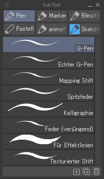 In CLIP STUDIO PAINT sind Tools nach Kategorien organisiert. Und jedes Tool verfügt über Sub-Tool-Kategorien. Die Zeichentools befinden sich alle in derselben Kategorie in der Sub-Tool Palette.
