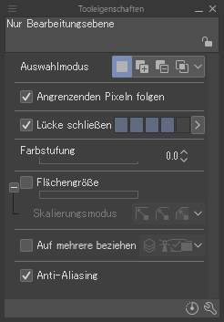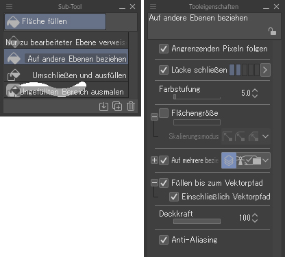Auf mehrere beziehen: Damit kannst du dich beim Füllen auf andere Ebenen beziehen. Verwende diese Einstellung, wenn du die Linienzeichnung und die Farben auf separaten Ebenen behalten willst.