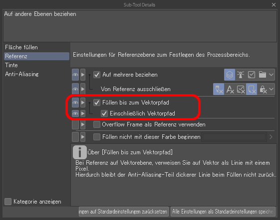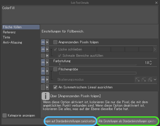 Klicke auf Alle Einstellungen als Standardeinstellungen speichern im Dialogfenster der Sub-Tool Details, um deine Änderungen zu speichern. Wenn du Einstellung nach dem Speichern versehentlich änderst, kannst du sie ganz einfach durch Klicken auf Alle Einstellungen auf Standardeinstellungen zurücksetzen wiederherstellen.