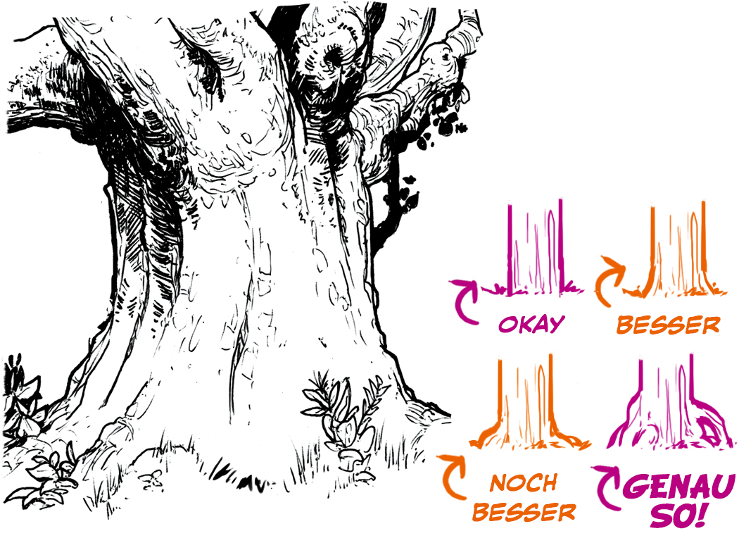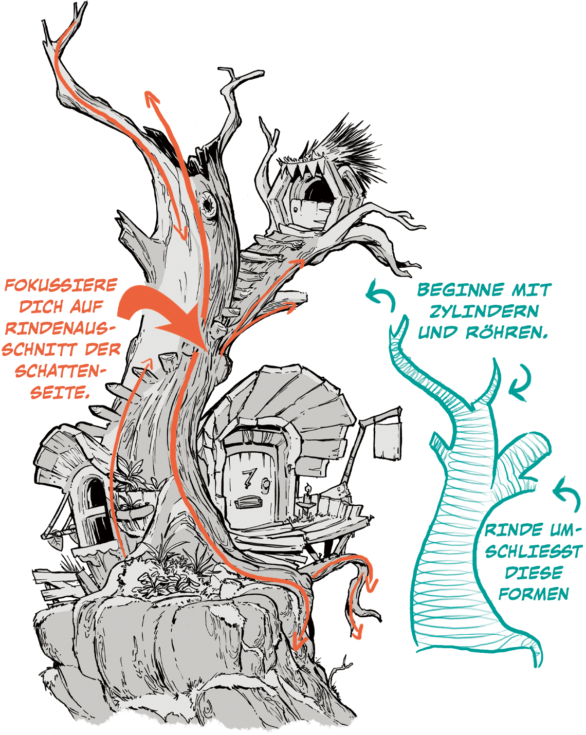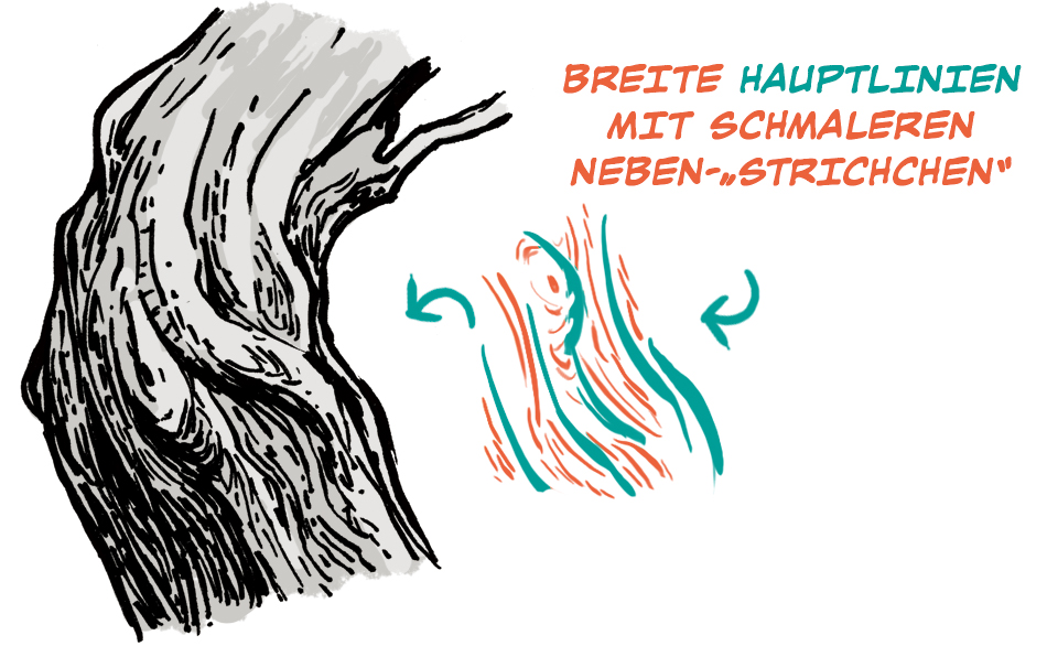 Bringe beim Zeichnen von Baumrinden schwungvolle Linien in deinen Bildaufbau mit der richtigen Textur und Kontur!