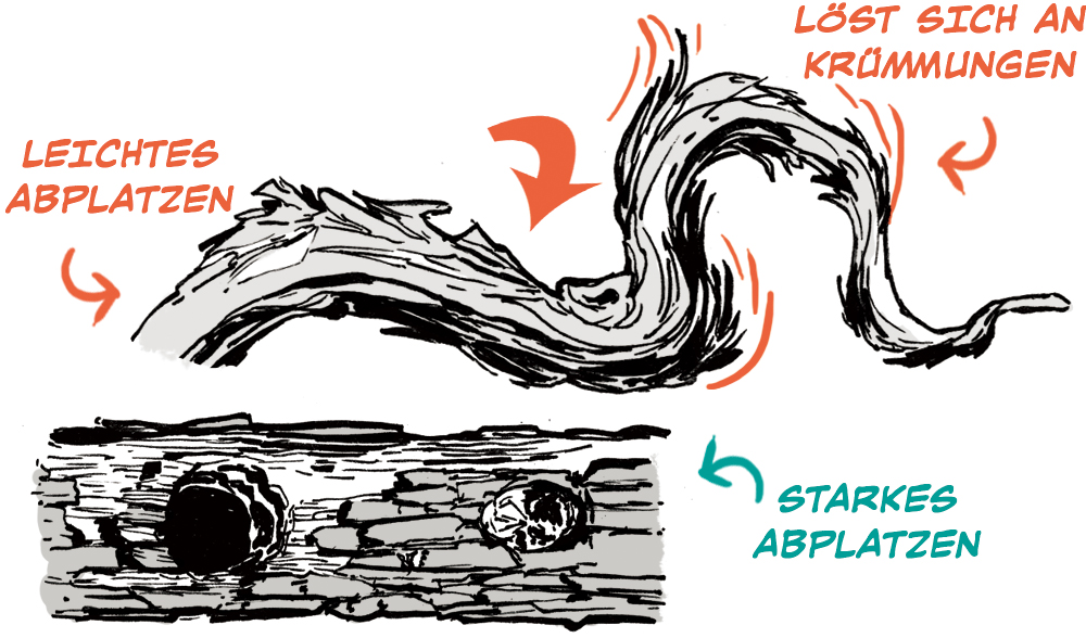 Abgeplatzte Rindenabschnitte legen den Stamm frei.