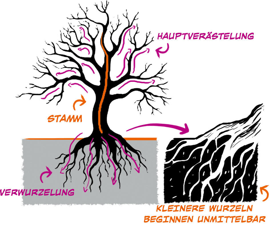 Die Verwurzelung spiegelt die Astgabeln des Baumes wider, wenn auch mit einem kompakteren Satz größerer Wurzel-„Zweige“.