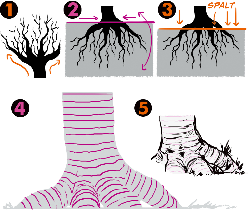Wurzeln wachsen über Felsen drüber. Also hast du mehr Freiheit bei der Gestaltung von Wurzelformen.