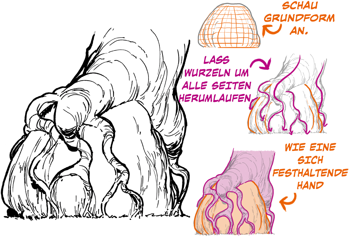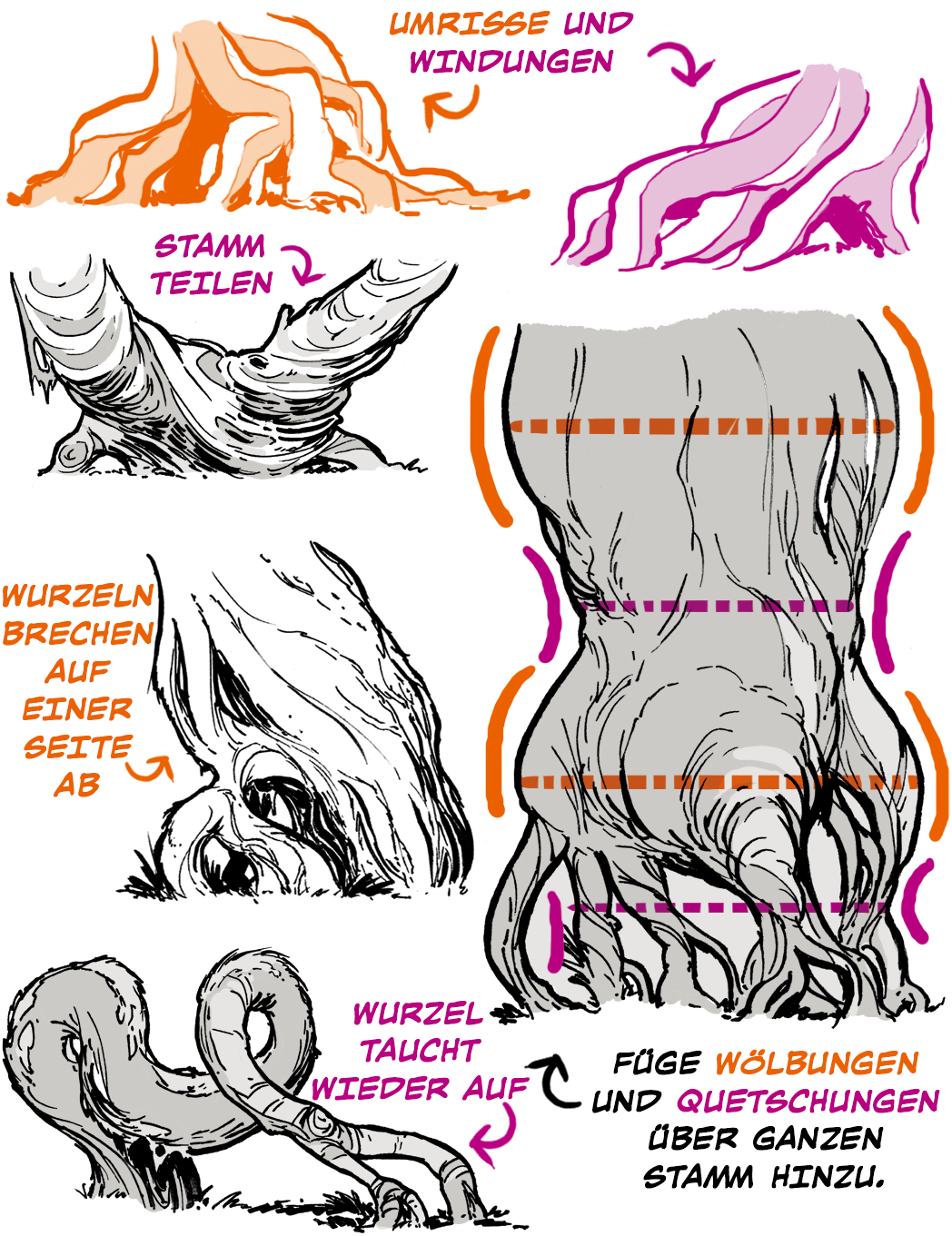 Und jetzt kommen wir zu den Baumwurzeln. Sie sind fantastische, kreative Elemente. Damit kannst du massenweise visuelle Blickfänger zu deinen Wald- und Dschungellandschaften hinzuzufügen. Lass dir hier die Angst vorm Zeichnen von Wurzeln nehmen!