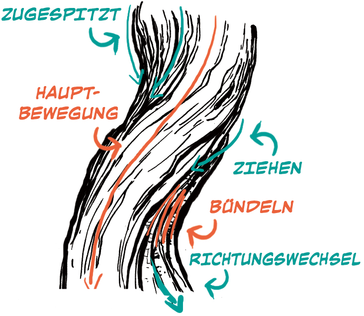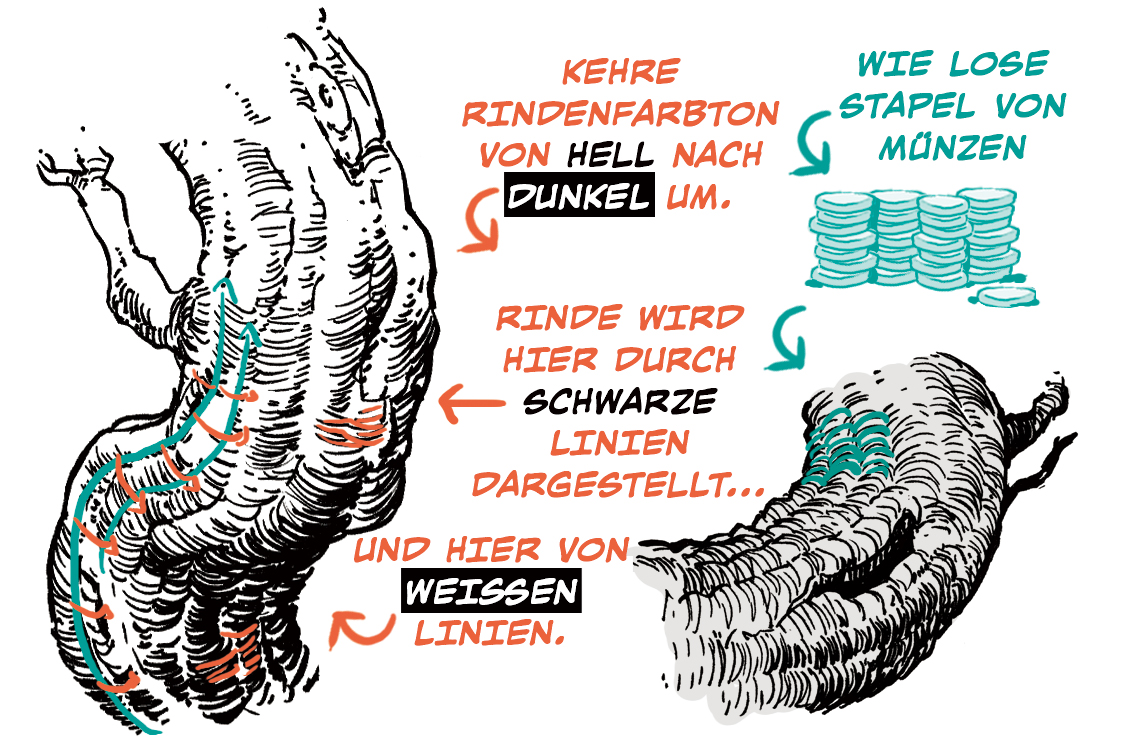 Ein filigranes, vertikales Rindenmuster zeichnest du am besten wie eine Holzmaserung.