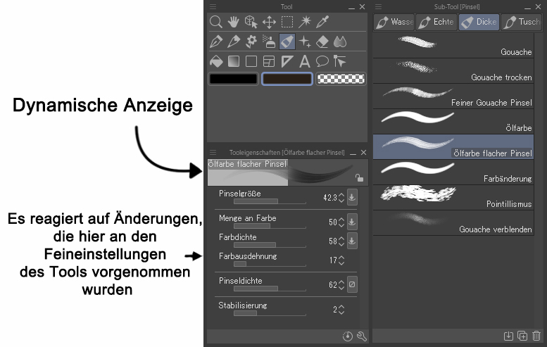 In meinen Augen gibt es nicht DEN EINEN Weg, wenn es um die Verwendung von CLIP STUDIO PAINTs Pinsel geht. Ich mag es, meine Tools beim Malen immer mal zu ändern, weil ich so hervorragend kleine Unfälle verursache oder eine ganz bestimmte Textur hervorzaubere. Mit CLIP STUDIO PAINT kannst du nämlich individuelle Einstellungen an deinen Tools vornehmen. Die Vorschau des Tools gibt dir eine Idee, welche Einstellungen verwendet werden sollten oder wie das Bild gezeichnet werden soll, um das gewünschte Ergebnis zu erzielen.