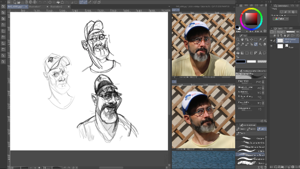 Ich fand schnell Gefallen daran, die Gesichter meiner Modelle während des Unterrichts für Aktzeichnen zu zeichnen. Das Karikieren hatte sich bei mir auf ganz natürliche Weise entwickelt. Ich bemerkte, dass das Hervorheben der Gesichtszüge einer Person das Porträt „akkurater“ macht. Dies ist auch eine hervorragende Methode, um deine Illustrationen zu stilisieren und zu vereinfachen. Ich male meine Karikaturen mit CLIP STUDIO PAINT, zeichne aber in einem Stil, der der traditionellen Kunst nahe ist, da ich nicht viele Ebenen verwende. Digitale Tools haben den Vorteil, dass sie den Arbeitsprozess vereinfachen, da du dich nicht mit Problemen wie dem Warten auf das Trocknen der Farbe befassen musst. Es ist auch einfacher, Fehler auf halbem Weg zu entfernen.