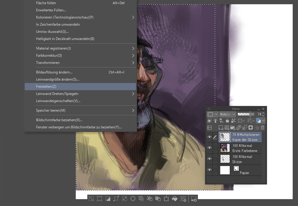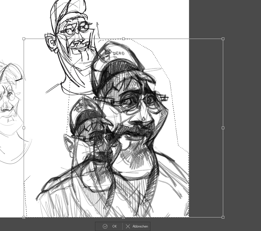 - Um eine bestimmte Skizze zu separieren und auszubauen, verwende das [Auswahl ] Tools und dann [Bearbeiten] Menü > [Transformieren] > [Skalieren/Drehen].