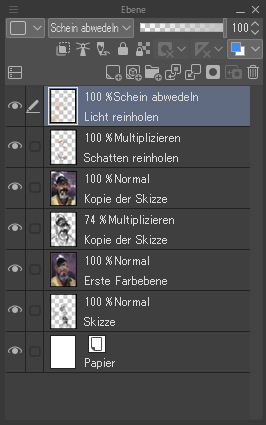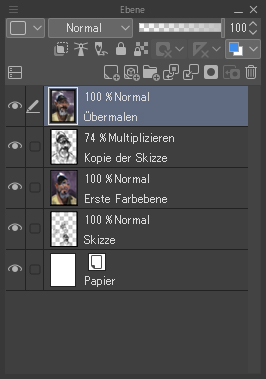 Anschließend setze ich die Füllmethode der neuen Ebene auf [Multiplizieren] und verringere die Deckkraft. Ich blende die Skizzenebene aus, weil ich sie nicht mehr brauche. Aber löschen tue ich sie nicht, sondern behalte sie als Backup.