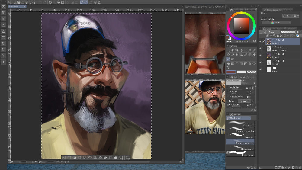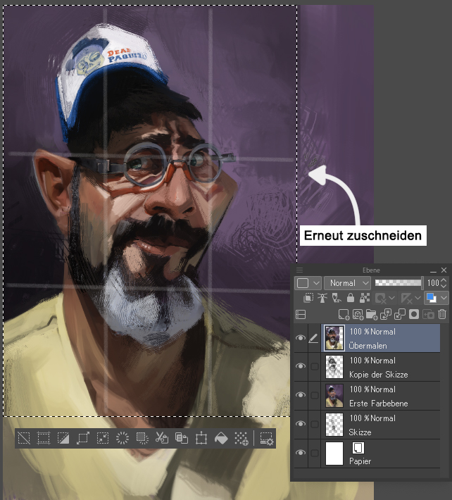 Um dein Bild wirkungsvoller zu gestalten, empfehle ich dir, einen Schwerpunkt zu setzen. Dafür könntest du weitere Details zu einem bestimmten Bereich hinzufügen. Meiner Meinung nach müssen diese Details umso weniger ausgearbeitet sein, je weiter man sich von diesem Bereich entfernt. Zum Beispiel ist das Logo auf der Kappe einfach gehalten, während der Bereich um die Augen und Brille sorgfältiger gemalt ist. Du solltest dich auf die imaginäre Stärke deines Bildes konzentrieren und dort Details hinzufügen, um eine ausgewogene Bildkomposition zu erhalten. Beim Hinein- und Herauszoomen schien mir diese Komposition nicht stimmig zu sein. Also habe ich das Bild noch einmal zugeschnitten.