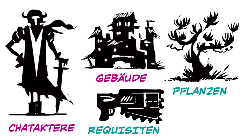 Miniaturbilder mit Silhouetten können für egal welche Kreation verwendet werden: Charaktere, Gebäude, Pflanzen, Requisiten usw.