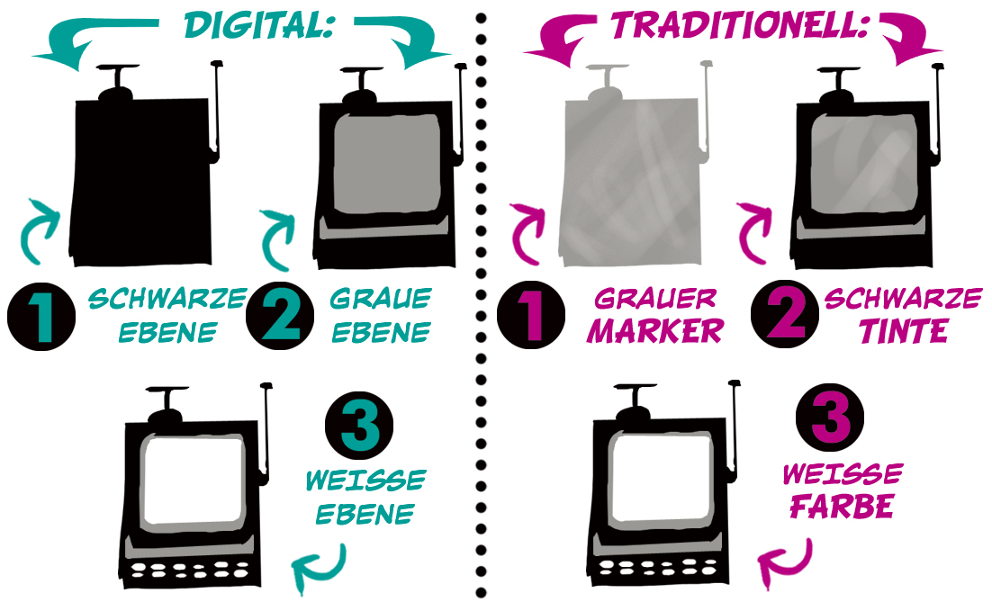 Es gibt zwei einfache 3-Farbton-Methoden, die vom Medium abhängen, mit dem du etwas erstellst: Digital & Analog.