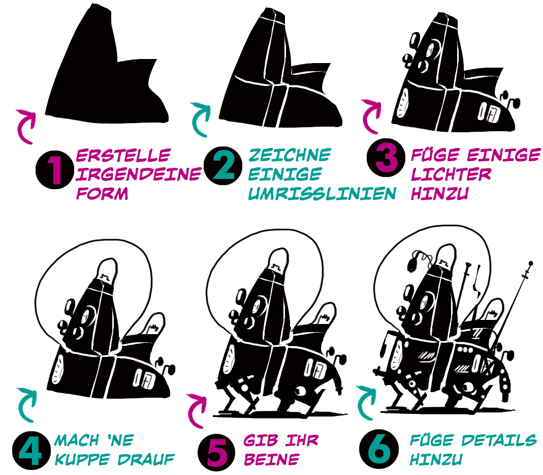 Zeichne eine zufällige Form. Es spielt keine Rolle, wie die Form aussieht. Einfach loslassen und Spaß haben. Zeichne dann einige Umrisslinien. Dann könntest du ein paar Lichter und Kuppen hinzufügen. Jetzt lass uns verrückt werden und dem Ganzen ein paar Beine geben! Beende es nun mit einigen letzten Details und schon bist du fertig! Wir haben eine zufällig gewählte Form in einen lustigen und futuristischen, mobilen Gegenstand verwandelt.