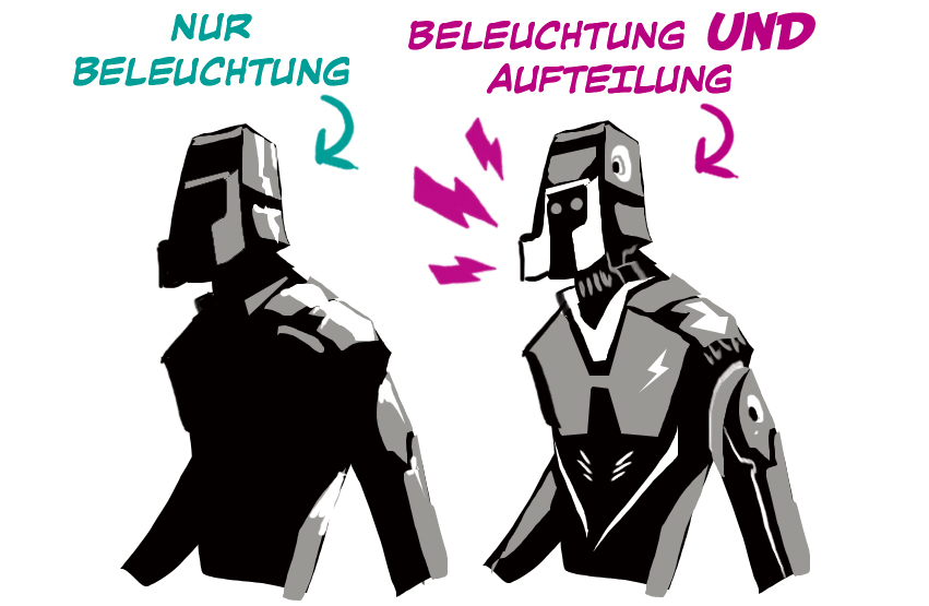 Sehr wichtig! Verwende deinen Zwischenton und das Weiß nicht nur, um Beleuchtung zu implizieren. Verwende es zum Beleuchten und Aufteilen.