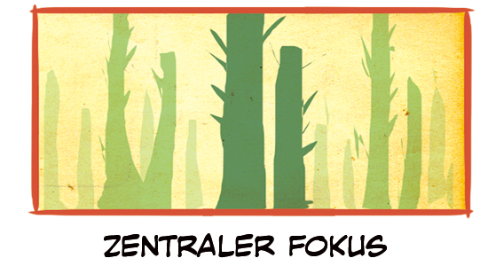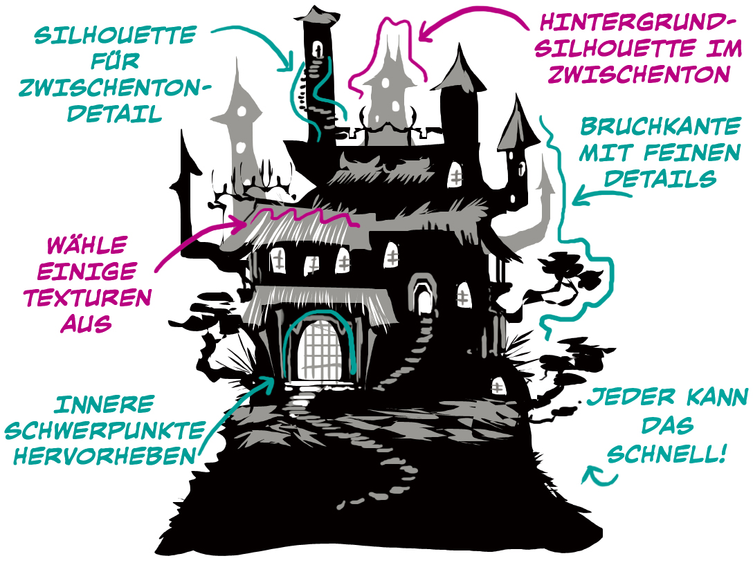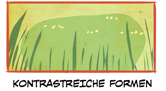 Dünner/dicker Kontrast bietet sich auch gut für Charaktere an, die aus einer Höhle oder einem Wald auftauchen. In dieser Version sehen wir das Ziel jedoch eher im Mittelgrund als im Hintergrund.