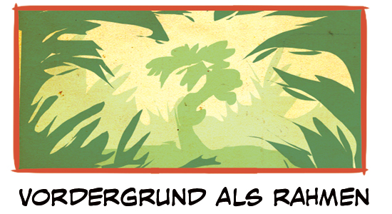 Eine andere Möglichkeit, den Blick des Lesers auf einen bestimmten Teil des Bild- oder Comic-Panels zu lenken, besteht darin, den Vordergrund als Rahmen für das Objekt zu verwenden, auf das sich die Augen richten sollen. Diese Komposition eignet sich auch gut, um ein Gefühl dynamischer Tiefe innerhalb des Panels zu erzeugen.