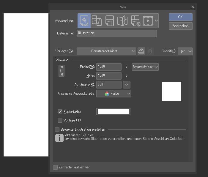 Der erste Schritt ist es, die Leinwand zu erstellen. In diesem Fall ist meine Leinwandgröße für Instagram 4000 x 4000 mit 300 dpi. Damit habe ich auch gleich die richtige Auflösung für den Druck. Aber wenn wir das Werk nur für den Bildschirm brauchen, reicht eine Datei mit niedrigerer Auflösung von 72 dpi und es wird immer noch fantastisch aussehen.