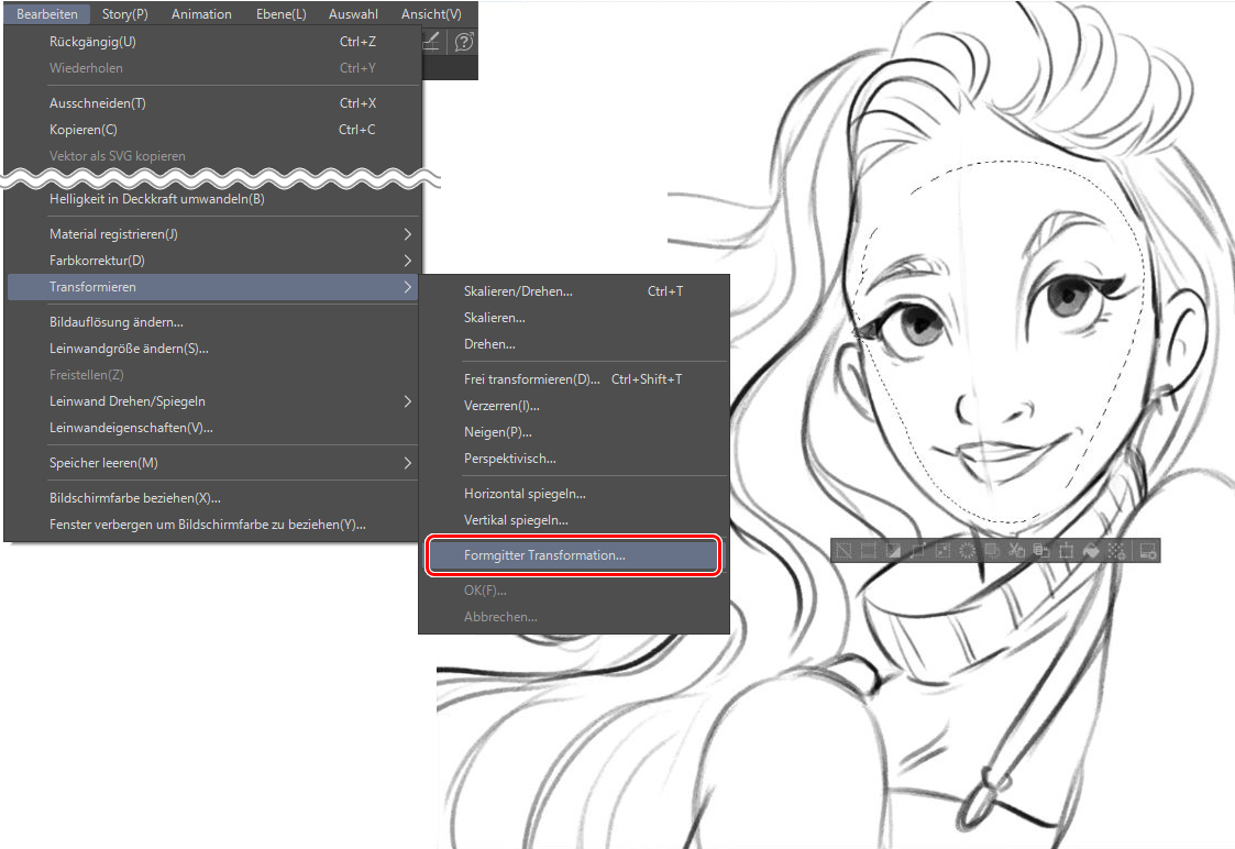 Beim Erstellen der Skizze verwende ich gerne einige Tools, um die Zeichnung an meine Bedürfnisse anzupassen, z. B. die Leinwand horizontal spiegeln, das Transformation-Tool und „Formgitter Transformation“. Sie helfen mir, die richtigen Proportionen und Ansichten meiner Porträts zu erhalten. Die „Formgitter Transformation“ findest du hier: Bearbeiten Menü > Transformieren > Formgitter Transformation.