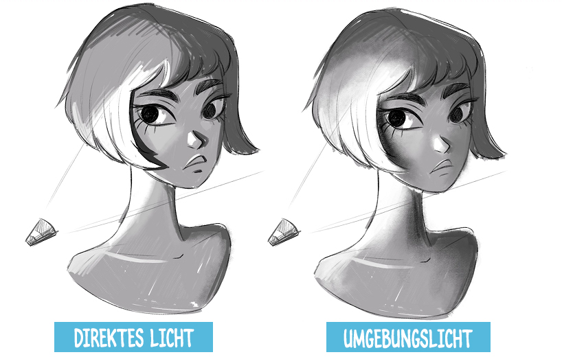 Beim direkten Licht scheint die Lichtquelle direkt und intensiv und kommt aus einer bestimmten Richtung. Die resultierenden Schatten sind dadurch stark und deutlich erkennbar, durch sehr dunkle Schwarztöne und hellere Weißtöne. Ein Beispiel wäre das von einer Taschenlampe erzeugte Licht. Andererseits kommt das Umgebungslicht von weitflächigen Lichtquellen wie der Sonne. Hier sind Licht und Schatten weicher und erzeugen keinen so starken Kontrast.