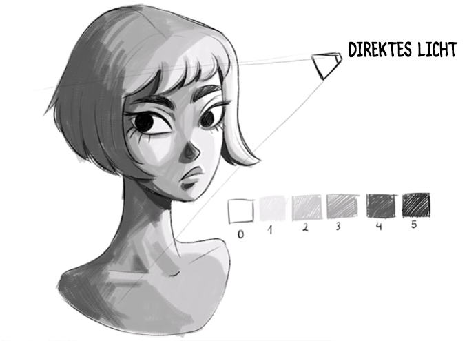Ganz rechts ist die hellste Stufe, während ganz links die dunkelste Schattierungsstufe ist. Beleuchtung ist ein komplexes Thema. Es gibt sogar Künstler, die sich ausschließlich damit beschäftigen. Aus diesem Grund, und um das Tutorial für Künstler unterschiedlicher Level zugänglich zu machen, werde ich die Beleuchtung auf eine Hauptlichtquelle beschränken.